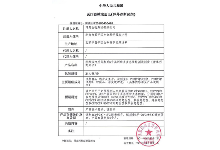 抗栓治療用藥相關(guān)6個(gè)基因位點(diǎn)多態(tài)性檢測(cè)試劑盒(微陣列芯片法)獲醫(yī)療器械注冊(cè)證