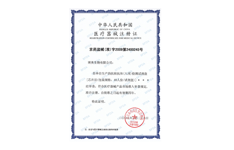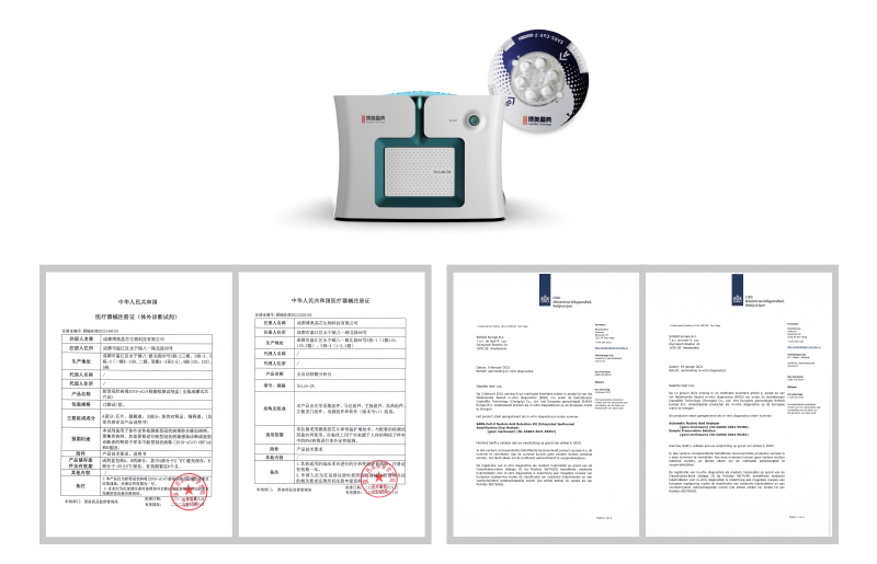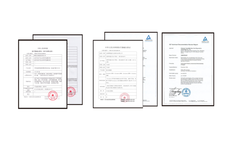 呼吸道病原菌核酸檢測(cè)試劑盒、地中海貧血基因檢測(cè)試劑盒、全自動(dòng)生物芯片反應(yīng)閱讀儀、雌二醇、睪酮、孕酮、β2-微球蛋白(磁微?;瘜W(xué)發(fā)光免疫分析法)獲醫(yī)療器械注冊(cè)證;流式細(xì)胞儀獲得醫(yī)療器械注冊(cè)證和CE證書;全自動(dòng)免疫化學(xué)發(fā)光分析儀獲得CE證書