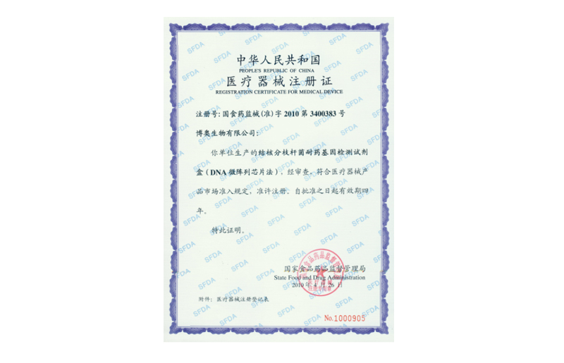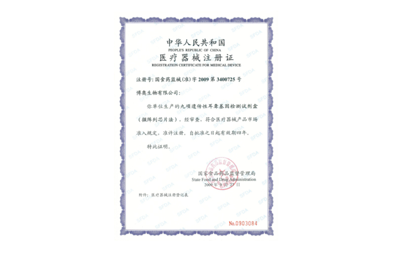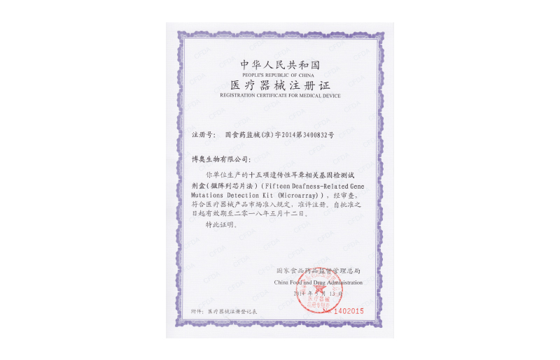 分枝桿菌核酸檢測(cè)試劑盒、分枝桿菌菌種鑒定試劑盒、九項(xiàng)遺傳性耳聾基因檢測(cè)試劑盒、地中海貧血基因檢測(cè)試劑盒、微陣列芯片掃描儀獲得泰國(guó)國(guó)家公共衛(wèi)生部食品藥品監(jiān)督管理局核發(fā)的醫(yī)療器械注冊(cè)證書
