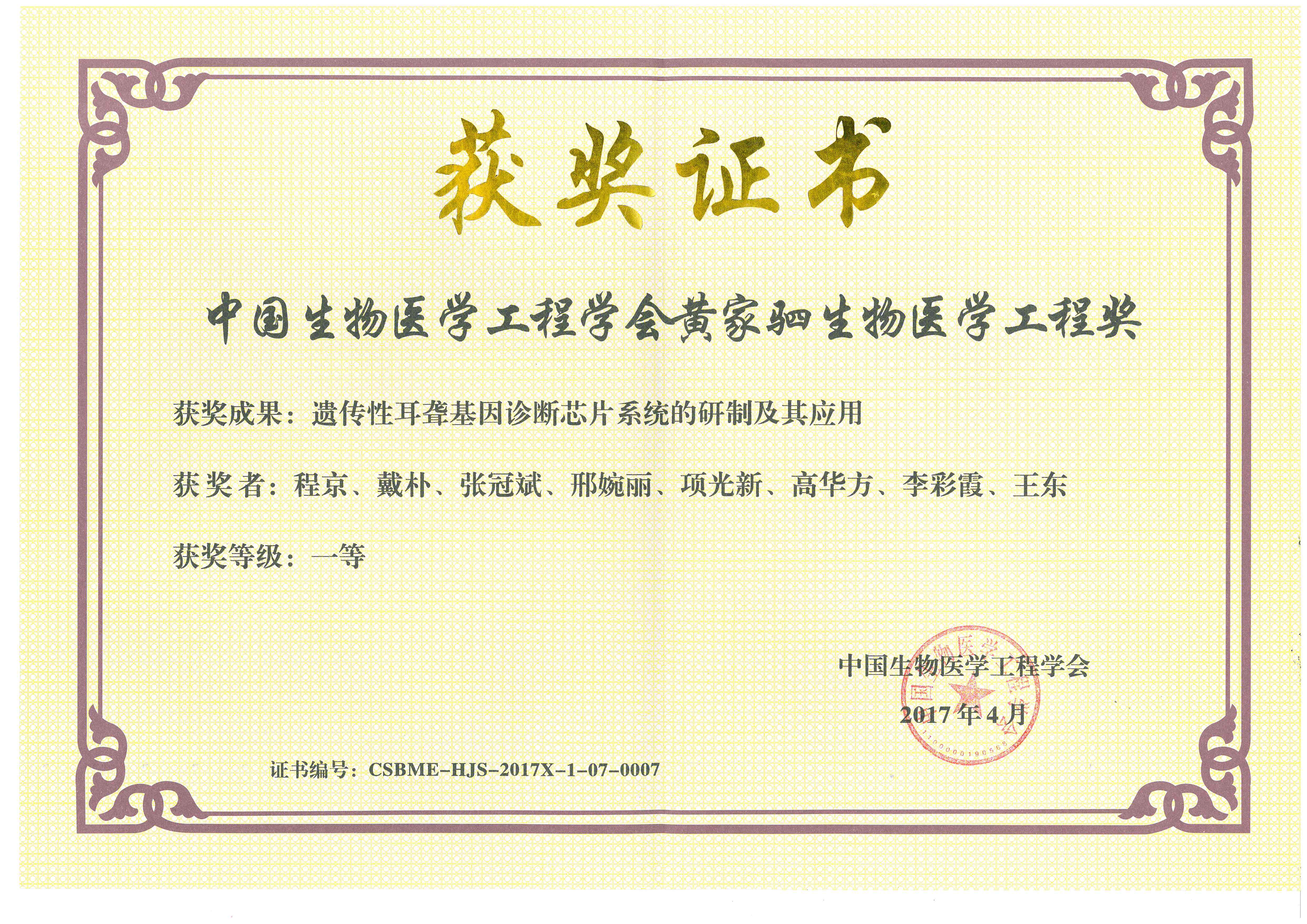 2017年度“黃家駟生物醫(yī)學(xué)工程獎(jiǎng)”揭曉 博奧生物“遺傳性耳聾基因診斷芯片系統(tǒng)”榮獲技術(shù)發(fā)明類一等獎(jiǎng)