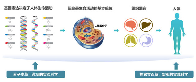 人的所有細胞都包含同一組基因(DNA),基因表達(RNA)的不同決定了形成不同組織器官、演發(fā)各種疾病發(fā)生。古代神農嘗百草通過人體測試發(fā)現(xiàn)中藥功能,是宏觀的實踐科學。分子本草是通過研究中藥對細胞內基因表達的作用研究中藥功能,是微觀的實驗科學。