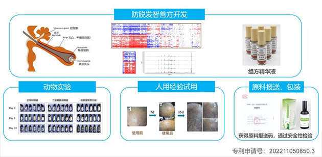以市場需求巨大的防脫發(fā)為例,基于毛乳頭細(xì)胞藥篩,從600多種中藥中,獲得1項(xiàng)防脫生發(fā)智善方,可以有效的促進(jìn)小鼠和人體的毛發(fā)再生,已完成原料報(bào)送、包裝,準(zhǔn)備上市階段。