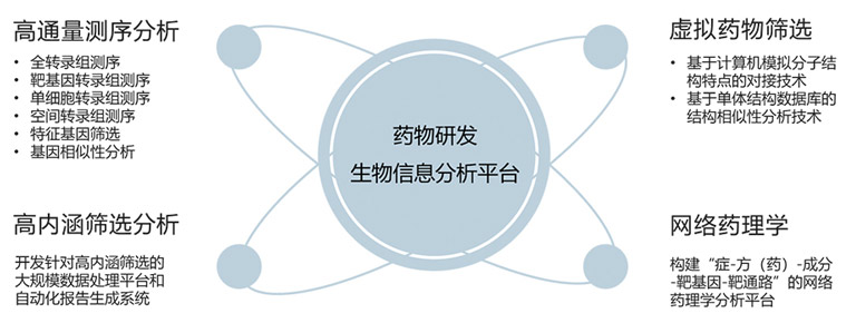 在新藥研發(fā)過程中,針對如何找到藥物作用靶點(diǎn),建立了以闡明“癥-方(藥)-成分-靶基因-靶通路”為目標(biāo)的虛擬藥物篩選平臺和網(wǎng)絡(luò)藥理學(xué)分析平臺。包括基于計(jì)算機(jī)模擬分子結(jié)構(gòu)特點(diǎn)的對接技術(shù)和基于中藥成分結(jié)構(gòu)數(shù)據(jù)庫的結(jié)構(gòu)相似性分析技術(shù),以及涵蓋了PPI蛋白互作關(guān)聯(lián)、轉(zhuǎn)錄因子調(diào)控、靶基因預(yù)測等多方面的網(wǎng)絡(luò)藥理學(xué)分析平臺。此外,整合包括全轉(zhuǎn)錄組、靶向轉(zhuǎn)錄組、單細(xì)胞轉(zhuǎn)錄組、空間轉(zhuǎn)錄組在內(nèi)的不同轉(zhuǎn)錄組數(shù)據(jù)類型,搭建高通量轉(zhuǎn)錄組測序自動化分析平臺。