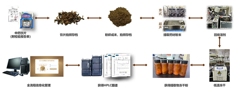 物質(zhì)庫平臺承擔(dān)研發(fā)用中藥飲片的采購、粉碎、提取和儲存,原料出入庫管理,中藥指紋圖譜分析等工作。根據(jù)當(dāng)前項(xiàng)目對中藥研發(fā)的需求,建立了(1)基于2020版《中國藥典》的616味中藥提取物庫;(2)包括藏藥、維藥、傣藥在內(nèi)的多個民族藥提取物庫。此外,平臺利用HPLC技術(shù)構(gòu)建中藥指紋圖譜,助力藥材質(zhì)量管理及成分檢測。結(jié)合中藥現(xiàn)代化、信息化管理需求,和大數(shù)據(jù)與人工智能研究院共同開發(fā)中藥高通量篩選實(shí)驗(yàn)室信息管理系統(tǒng),實(shí)現(xiàn)對藥物采購、出入庫、提取、儲存、質(zhì)控全流程的數(shù)字化可溯源管理。物質(zhì)庫平臺極大地提高了中藥研究的準(zhǔn)確性和可重復(fù)性,為藥理藥效研究提供了全方位的支持。