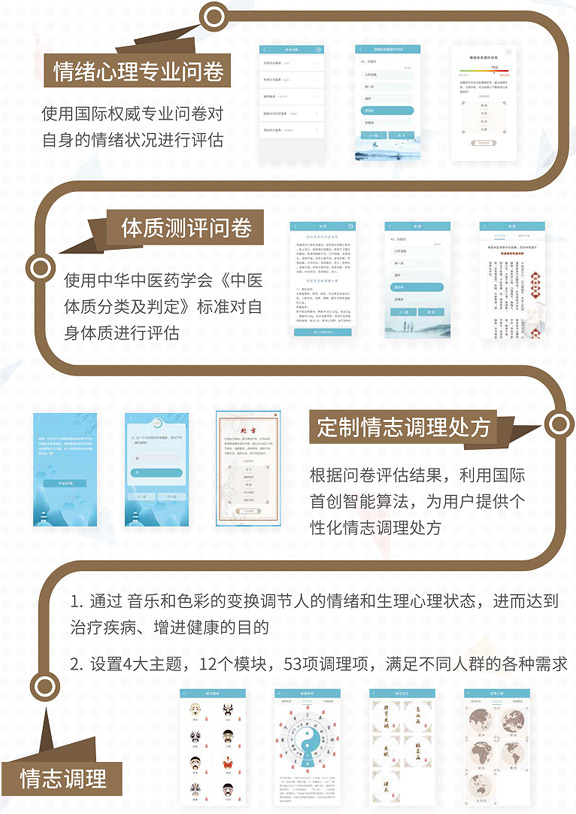 (1)國際首創(chuàng)的融合藝術(shù)、人文、心理學、中醫(yī)、腦科學、多媒體等多學科的情志調(diào)理系統(tǒng),并在慢性疾病非藥物治療領(lǐng)域開展了有益探索。