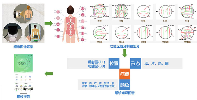 罐診是中醫(yī)診斷的重要手段之一,是在人體背部督脈、膀胱經(jīng)上的反應點選取相應的功能反應區(qū)扣拔11罐,扣拔五分鐘后起罐形成的罐象結(jié)合中醫(yī)學說的寒熱虛實等來判斷人體五臟六腑的功能狀態(tài)。基于博奧生物集團有限公司開發(fā)的罐診儀,研究院開發(fā)了基于人工智能的罐診信息系統(tǒng)。該系統(tǒng)通過罐象反射區(qū)和功能區(qū)圖像分割,根據(jù)各區(qū)域的形態(tài)和顏色特征,自動識別健康狀態(tài)和易患病癥,并形成罐診報告。